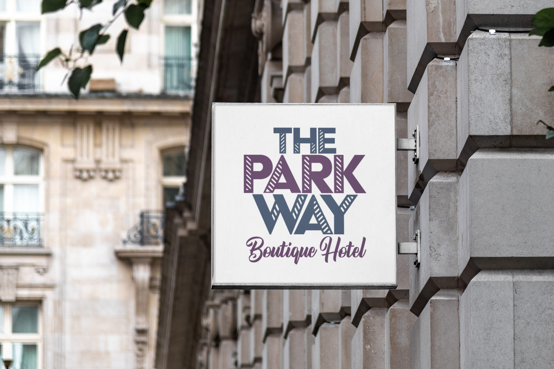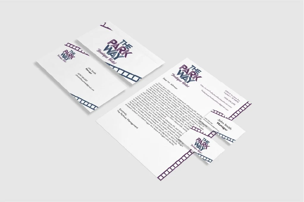 The Parkway Boutique Hotel is a hypothetical hotel chain that is opening in the Fox Valley. For this project I restricted myself to only being able to use text to create this logo. I went with a Art Deco styled font to have a more artistic feel for the brand. I then added diagonal lines in the white space of the letters to added more dimension to the text and create a more sophisticated appearance. The choice to use dark blue and purple for the logo and branding to bring a feeling of peacefulness and relaxation for when customers stay at the hotel. For graphic assets I stayed consistent with the lines in the white space of the letters and used it both of the brand’s colors.